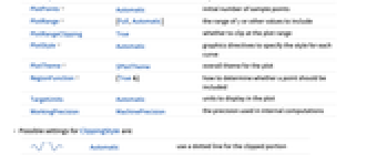 AspectRatio 1/GoldenRatio ratio of height to width Axes True whether to draw axes ClippingStyle None what to draw where curves are clipped ColorFunction Automatic how to determine the coloring of curves ColorFunctionScaling True whether to scale arguments to ColorFunction EvaluationMonitor None expression to evaluate at every function evaluation Exclusions Automatic points in x to exclude ExclusionsStyle None what to draw at excluded points Filling None filling to insert under each curve FillingStyle Automatic style to use for filling LabelingSize Automatic maximum size of callouts and labels MaxRecursion Automatic the maximum number of recursive subdivisions allowed Mesh None how many mesh points to draw on each curve MeshFunctions {#1&} how to determine the placement of mesh points MeshShading None how to shade regions between mesh points MeshStyle Automatic the style for mesh points Method Automatic the method to use for refining curves PerformanceGoal $PerformanceGoal aspects of performance to try to optimize PlotHighlighting Automatic highlighting effect for curves PlotInteractivity $PlotInteractivity whether to allow interactive elements PlotLabel None overall label for the plot PlotLabels None labels to use for curves PlotLegends None legends for curves PlotPoints Automatic initial number of sample points PlotRange {Full,Automatic} the range of y or other values to include PlotRangeClipping True whether to clip at the plot range PlotStyle Automatic graphics directives to specify the style for each curve PlotTheme $PlotTheme overall theme for the plot RegionFunction (True&) how to determine whether a point should be included TargetUnits Automatic units to display in the plot WorkingPrecision MachinePrecision the precision used in internal computations - Possible settings for ClippingStyle are: