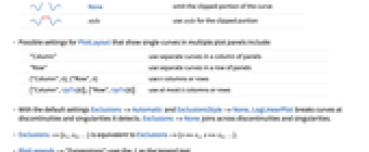 "Column" use separate curves in a column of panels "Row" use separate curves in a row of panels {"Column",k},{"Row",k} use k columns or rows {"Column",UpTo[k]},{"Row",UpTo[k]} use at most k columns or rows - With the default settings Exclusions->Automatic and ExclusionsStyle->None, LogLinearPlot breaks curves at discontinuities and singularities it detects. Exclusions->None joins across discontinuities and singularities.