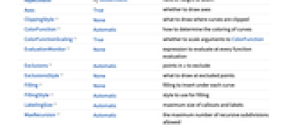 AspectRatio 1/GoldenRatio ratio of height to width Axes True whether to draw axes ClippingStyle None what to draw where curves are clipped ColorFunction Automatic how to determine the coloring of curves ColorFunctionScaling True whether to scale arguments to ColorFunction EvaluationMonitor None expression to evaluate at every function evaluation Exclusions Automatic points in x to exclude ExclusionsStyle None what to draw at excluded points Filling None filling to insert under each curve FillingStyle Automatic style to use for filling LabelingSize Automatic maximum size of callouts and labels MaxRecursion Automatic the maximum number of recursive subdivisions allowed Mesh None how many mesh points to draw on each curve MeshFunctions {#1&} how to determine the placement of mesh points MeshShading None how to shade regions between mesh points MeshStyle Automatic the style for mesh points Method Automatic the method to use for refining curves PerformanceGoal $PerformanceGoal aspects of performance to try to optimize PlotHighlighting Automatic highlighting effect for curves PlotInteractivity $PlotInteractivity whether to allow interactive elements PlotLabel None overall label for the plot PlotLabels None labels to use for curves PlotLegends None legends for curves PlotPoints Automatic initial number of sample points PlotRange {Full,Automatic} the range of y or other values to include PlotRangeClipping True whether to clip at the plot range PlotStyle Automatic graphics directives to specify the style for each curve PlotTheme $PlotTheme overall theme for the plot RegionFunction (True&) how to determine whether a point should be included ScalingFunctions None how to scale individual coordinates TargetUnits Automatic units to display in the plot WorkingPrecision MachinePrecision the precision used in internal computations - Possible settings for ClippingStyle are: