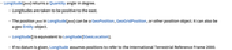 - The position pos in Longitude[pos] can be a GeoPosition, GeoGridPosition, or other position object. It can also be a geo Entity object.