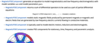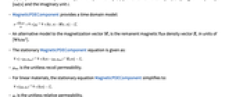 - MagneticPDEComponent generates an equation to model magnetostatics and low-frequency electromagnetics with model variables vars and model parameters pars.