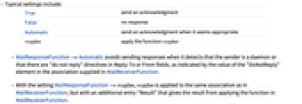 True send an acknowledgment False no response Automatic send an acknowledgment when it seems appropriate respfun apply the function respfun - MailResponseFunction->Automatic avoids sending responses when it detects that the sender is a daemon or that there are "do not reply" directives in Reply-To or From fields, as indicated by the value of the "DoNotReply" element in the association supplied in MailReceiverFunction.