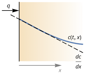Model a 1D chemical species field in an incompressible fluid whose right side and left side are subjected to a mass concentration and inflow condition, respectively: