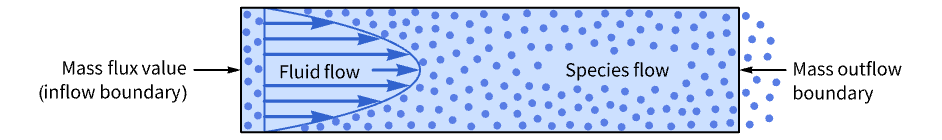 - MassOutflowValue is typically used to model a mass outlet for a convective mass transport where mass is transferred out of the domain by fluid flow.