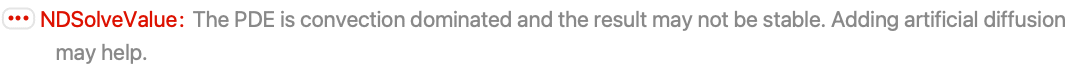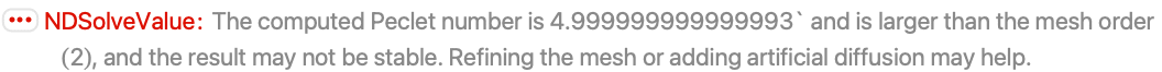 When a discretized region is given and the mesh does not meet the quality criteria for a large convection-to-diffusion ratio, a message is generated. Model a 1D non-conservative chemical species field with a high convection velocity to diffusivity ratio, expressed as follows:
