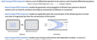 - MassTransportPDEComponent models the generation and propagation of diluted mass species in physical systems such as mixtures, solutions and solids by mechanisms of diffusion or convection.