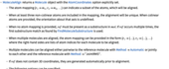 - When multiple molecules are aligned, the atom mapping can be provided in the form {r1{…},r2{…},…} where the right-hand sides are lists of atom indices for each molecule to be aligned.