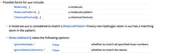 Molecule[…] a molecule MoleculePattern[…] a molecule pattern ChemicalFormula[…] a chemical formula - A molecule mol is considered to match a MoleculePattern if every non-hydrogen atom in mol has a matching atom in the pattern.