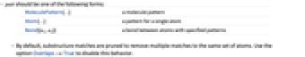 MoleculePattern[…] a molecule pattern Atom[…] a pattern for a single atom Bond[{a1,a2}] a bond between atoms with specified patterns - By default, substructure matches are pruned to remove multiple matches to the same set of atoms. Use the option Overlaps->True to disable this behavior.