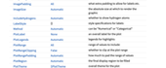 AlignmentPoint Center the default point in the graphic to align with AspectRatio Automatic ratio of height to width Axes False whether to draw axes AxesLabel None axes labels AxesOrigin Automatic where axes should cross AxesStyle {} style specifications for the axes Background None background color for the plot BaselinePosition Automatic how to align with a surrounding text baseline BaseStyle {} base style specifications for the graphic ColorFunction Automatic how to deteremine coloring ColorFunctionScaling True whether to scale arguments to ColorFunction ColorRules Automatic colors to use for specific values when plotting categorical data ContentSelectable Automatic whether to allow contents to be selected CoordinatesToolOptions Automatic detailed behavior of the coordinates tool Epilog {} primitives rendered after the main plot FormatType TraditionalForm the default format type for text Frame False whether to put a frame around the plot FrameLabel None frame labels FrameStyle {} style specifications for the frame FrameTicks Automatic frame ticks FrameTicksStyle {} style specifications for frame ticks GridLines None grid lines to draw GridLinesStyle {} style specifications for grid lines ImageMargins 0. the margins to leave around the graphic ImagePadding All what extra padding to allow for labels etc. ImageSize Automatic the absolute size at which to render the graphic IncludeHydrogens Automatic whether to show hydrogen atoms LabelStyle {} style specifications for labels Method Automatic can be "Numerical" or "Categorical" PlotLabel None an overall label for the plot PlotLegends Automatic legends for highlights PlotRange All range of values to include PlotRangeClipping False whether to clip at the plot range PlotRangePadding Automatic how much to pad the range of values PlotRegion Automatic the final display region to be filled PlotTheme $PlotTheme overall theme for the plot PreserveImageOptions Automatic whether to preserve image options when displaying new versions of the same graphic Prolog {} primitives rendered before the main plot RotateLabel True whether to rotate y labels on the frame Ticks Automatic axes ticks TicksStyle {} style specifications for axes ticks