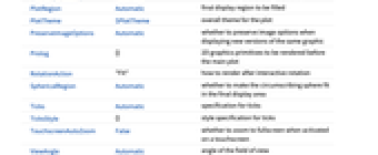 AlignmentPoint Center the default point in the graphic to align with AspectRatio Automatic ratio of height to width Axes False whether to draw axes AxesEdge Automatic on which edges to put axes AxesLabel None axes labels AxesOrigin Automatic where axes should cross AxesStyle {} graphics directives to specify the style for axes Background None background color for the plot BaselinePosition Automatic how to align with a surrounding text baseline BaseStyle {} base style specifications for the graphic Boxed True whether to draw the bounding box BoxRatios Automatic bounding 3D box ratios BoxStyle {} style specifications for the box ClipPlanes None clipping planes ClipPlanesStyle Automatic style specifications for clipping planes ColorFunction Automatic how to deteremine coloring ColorFunctionScaling True whether to scale arguments to ColorFunction ColorRules Automatic colors to use for specific values when plotting categorical data ContentSelectable Automatic whether to allow contents to be selected ControllerLinking False when to link to external rotation controllers ControllerPath Automatic what external controllers to try to use Epilog {} 2D graphics primitives to be rendered after the main plot FaceGrids None grid lines to draw on the bounding box FaceGridsStyle {} style specifications for face grids FormatType TraditionalForm default format type for text ImageMargins 0. the margins to leave around the graphic ImagePadding All what extra padding to allow for labels, etc. ImageSize Automatic absolute size at which to render the graphic IncludeHydrogens Automatic whether to show hydrogen atoms LabelStyle {} style specifications for labels Lighting Automatic simulated light sources to use Method Automatic can be "Numerical" or "Categorical" PlotLabel None a label for the plot PlotLegends Automatic legends for highlights PlotRange All range of values to include PlotRangePadding Automatic how much to pad the range of values PlotRegion Automatic final display region to be filled PlotTheme $PlotTheme overall theme for the plot PreserveImageOptions Automatic whether to preserve image options when displaying new versions of the same graphic Prolog {} 2D graphics primitives to be rendered before the main plot RotationAction "Fit" how to render after interactive rotation SphericalRegion Automatic whether to make the circumscribing sphere fit in the final display area Ticks Automatic specification for ticks TicksStyle {} style specification for ticks TouchscreenAutoZoom False whether to zoom to fullscreen when activated on a touchscreen ViewAngle Automatic angle of the field of view ViewCenter Automatic point to display at the center ViewMatrix Automatic explicit transformation matrix ViewPoint {1.3,-2.4,2.} viewing position ViewProjection Automatic projection method for rendering objects distant from the viewer ViewRange All range of viewing distances to include ViewVector Automatic position and direction of a simulated camera ViewVertical {0,0,1} direction to make vertical