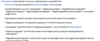 - "Lexicographic" gives the reverse of "NegativeLexicographic", and is the default for MonomialList.