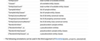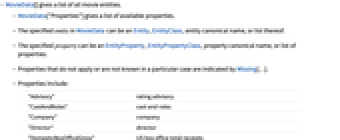 "Entities" all available entities "EntityCount" total number of available entities "Classes" all available entity classes "EntityClassCount" total number of available entity classes "SampleEntities" list of sample entities "SampleEntityClasses" list of sample entity classes "EntityCanonicalNames" list of all entity canonical names "PropertyCanonicalNames" list of all property canonical names "EntityClassCanonicalNames" list of all entity class canonical names "RandomEntities" pseudorandom sample entities {"RandomEntities",n} n pseudorandom entities "RandomEntityClasses" pseudorandom sample entity classes {"RandomEntityClasses",n} n pseudorandom entity classes - The following annotations can be used in the third argument of MovieData[entity,property,annotation]: