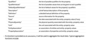 "Qualifiers" the list of possible qualifiers for the property "QualifierValues" the list of possible values that can be given to each qualifier "DefaultQualifierValues" the list of default values for the property's qualifiers "Description" a brief textual description of the property "Definition" a detailed textual definition of the property "Source" source information for the property "Date" the date associated with the entity-property value (if any) "PhysicalQuantity" the physical quantity associated with the entity-property value "Unit" the unit associated with the entity-property value "EntityAssociation" an association of entities and entity-property values "PropertyAssociation" an association of properties and entity-property values - If a function is provided as an annotation, it will be used to aggregate the result data. Typical aggregation functions include: