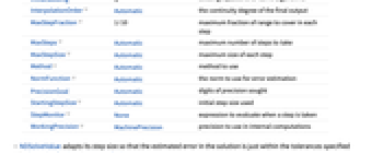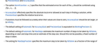 AccuracyGoal Automatic digits of absolute accuracy sought Compiled Automatic whether expressions should be compiled automatically DependentVariables Automatic the list of all dependent variables EvaluationMonitor None expression to evaluate whenever the function is evaluated InitialSeeding {} seeding equations for some algorithms InterpolationOrder Automatic the continuity degree of the final output MaxStepFraction 1/10 maximum fraction of range to cover in each step MaxSteps Automatic maximum number of steps to take MaxStepSize Automatic maximum size of each step Method Automatic method to use NormFunction Automatic the norm to use for error estimation PrecisionGoal Automatic digits of precision sought StartingStepSize Automatic initial step size used StepMonitor None expression to evaluate when a step is taken WorkingPrecision MachinePrecision precision to use in internal computations - NDSolveValue adapts its step size so that the estimated error in the solution is just within the tolerances specified by PrecisionGoal and AccuracyGoal.