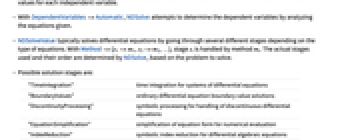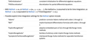 "TimeIntegration" time integration for systems of differential equations "BoundaryValues" ordinary differential equation boundary value solutions "DiscontinuityProcessing" symbolic processing for handling of discontinuous differential equations "EquationSimplification" simplification of equation form for numerical evaluation "IndexReduction" symbolic index reduction for differential algebraic equations "DAEInitialization" consistent initialization for differential algebraic equations "PDEDiscretization" discretization for partial differential equations - With Method->m1 or Method->{m1,s2->m2,…}, the method m1 is assumed to be for time integration, so Method->m1 is equivalent to Method->{"TimeIntegration"->m1}.