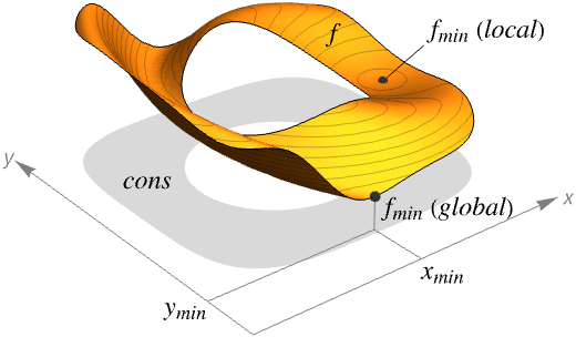 gives the global minimum value of f subject to the constraints cons.