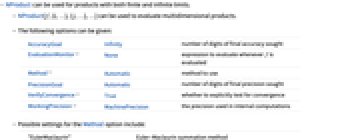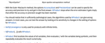 "EulerMaclaurin" Euler–Maclaurin summation method "WynnEpsilon" Wynn epsilon extrapolation method - With the Euler–Maclaurin method, the options AccuracyGoal and PrecisionGoal can be used to specify the accuracy and precision to try and get in the final answer. NProduct stops when the error estimates it gets imply that either the accuracy or precision sought has been reached.