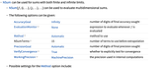 AccuracyGoal Infinity number of digits of final accuracy sought EvaluationMonitor None expression to evaluate whenever f is evaluated Method Automatic method to use NSumTerms 15 number of terms to use before extrapolation PrecisionGoal Automatic number of digits of final precision sought VerifyConvergence True whether to explicitly test for convergence WorkingPrecision MachinePrecision the precision used in internal computations - Possible settings for the Method option include: