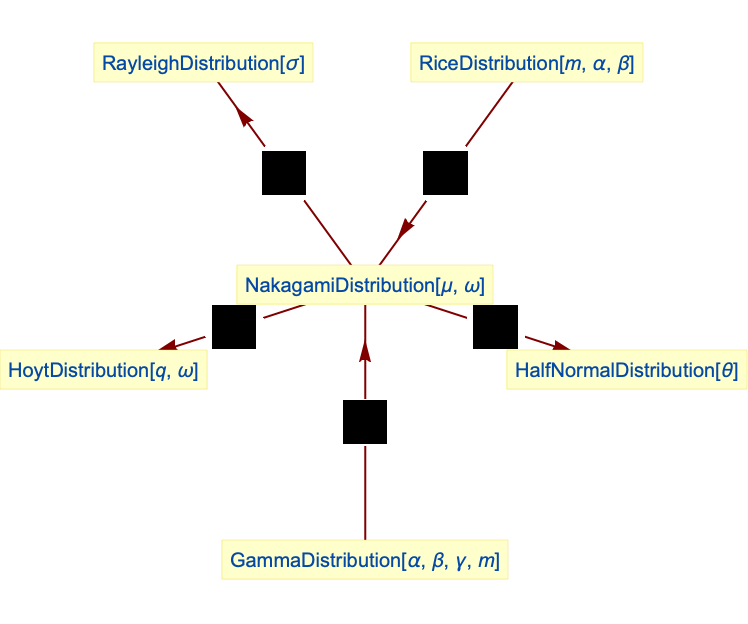 - NakagamiDistribution is related to a number of other distributions. Before the formulation of the Nakagami distribution, the RayleighDistribution and RiceDistribution were commonly used models for wave fading, and the three distributions are qualitatively very similar. In addition, NakagamiDistribution generalizes both RayleighDistribution and HalfNormalDistribution, in the sense that the CDF of NakagamiDistribution[1,2 σ^2] is precisely that of RayleighDistribution[σ], while the PDF of NakagamiDistribution[1/2, π/(2 θ^2)] is exactly that of HalfNormalDistribution[θ]. Moreover, NakagamiDistribution[μ,ω] has the same PDF as both GammaDistribution[μ,Sqrt[ω]/Sqrt[μ],2,0] and as the limit of RiceDistribution[μ,α,Sqrt[ω/2]] as α→0. NakagamiDistribution is also related to HoytDistribution, NormalDistribution, and LogNormalDistribution.