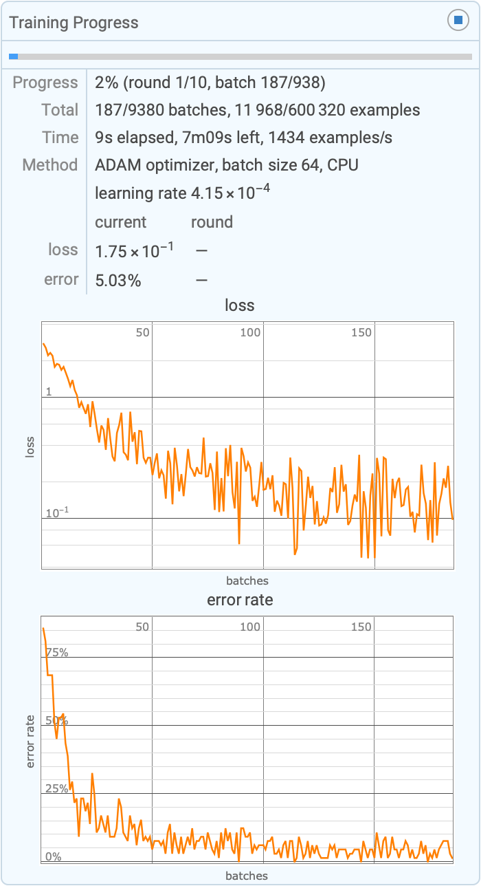 "TrainedNet" the optimal trained network found (default) "BatchesPerRound" the number of batches contained in a single round "BatchLossList" a list of the mean losses for each batch update "BatchMeasurementsLists" list of training measurements associations for each batch update "BatchPermutation" an array of the indices from the training data used to populate each batch "BatchSize" the effective value of BatchSize "BestValidationRound" the training round corresponding to the final trained net "CheckpointingFiles" list of checkpointing files generated during training "ExampleLosses" losses taken by each example during training "ExamplesProcessed" total number of examples processed during training "FinalLearningRate" the learning rate at the end of training "FinalNet" the most recent network generated in the training process, regardless of its performance on the validation set or other metrics "FinalPlots" association of plots for all losses and measurements "InitialLearningRate" the learning rate at the start of training "LossPlot" a plot of the evolution of the mean training loss "MeanBatchesPerSecond" the mean number of batches processed per second "MeanExamplesPerSecond" the mean number of input examples processed per second "NetTrainInputForm" an expression representing the originating call to NetTrain "OptimizationMethod" the name of the optimization method used "Properties" the full list of available properties "ReasonTrainingStopped" brief description of why training stopped "ResultsObject" a NetTrainResultsObject[…] containing a majority of the available properties in this table "RoundLoss" the mean loss for the most recent round "RoundLossList" a list of the mean losses for each round "RoundMeasurements" association of training measurements for the most recent round "RoundMeasurementsLists" list of training measurements associations for each round "RoundPositions" the batch numbers corresponding to each round measurement "TargetDevice" the device used for training "TotalBatches" the total number of batches encountered during training "TotalRounds" the total number of rounds of training performed "TotalTrainingTime" the total time spent training, in seconds "TrainingExamples" the number of examples in the training set "TrainingNet" the network as prepared for training "TrainingUpdateSchedule" the value of TrainingUpdateSchedule "ValidationExamples" the number of examples in the validation set "ValidationLoss" the mean loss obtained on the ValidationSet for the most recent validation measurement "ValidationLossList" list of the mean losses on the ValidationSet for each validation measurement "ValidationMeasurements" association of training measurements on the ValidationSet after the most recent validation measurement "ValidationMeasurementsLists" list of training measurements associations on the ValidationSet for each validation measurement "ValidationPositions" the batch numbers corresponding to each validation measurement "WeightsLearningRateMultipliers" an association of the learning rate multiplier used for each weight - An association of the form <|"Property"->prop,"Form"->form,"Interval"->int|> can be used to specify a custom property whose value will be collected repeatedly during training.