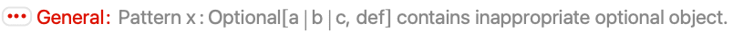 - The value def in Optional[s_h,def] need not have the head h. More generally, the default value need not match any pattern requirements for optional arguments that are actually present. »