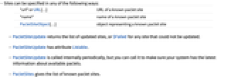 "url" or URL[…] URL of a known paclet site "name" name of a known paclet site PacletSiteObject[…] object representing a known paclet site - PacletSiteUpdate returns the list of updated sites, or $Failed for any site that could not be updated.