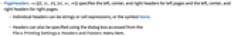 - PageHeaders->{{ll, lc, lr},{rl, rc, rr}} specifies the left, center, and right headers for left pages and the left, center, and right headers for right pages.