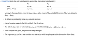 - PairedTTest[dspec,μ0,"HypothesisTestData"] returns a HypothesisTestData object htd that can be used to extract additional test results and properties using the form htd["property"].