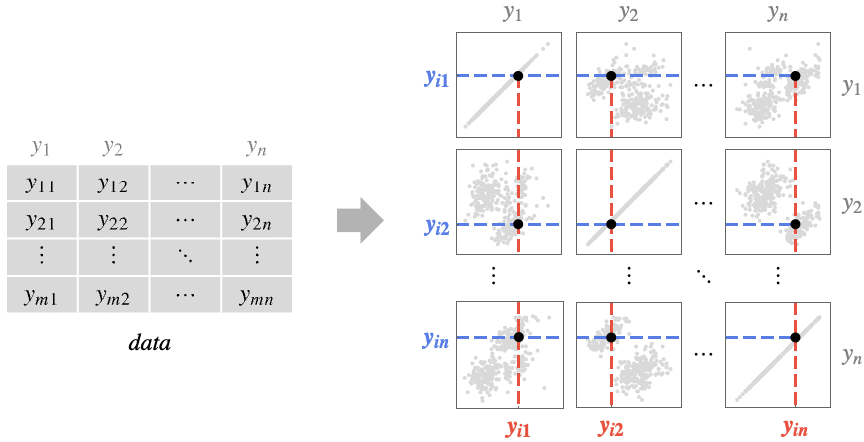 - The plot compares column yi={y1i,y2i,…,ymi} against column yj={y1j,y2j,…,ymj} by plotting the points {ykj,yki} in panel {i,j}.