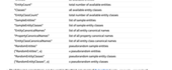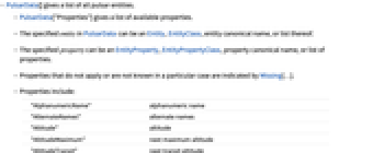"Entities" all available entities "EntityCount" total number of available entities "Classes" all available entity classes "EntityClassCount" total number of available entity classes "SampleEntities" list of sample entities "SampleEntityClasses" list of sample entity classes "EntityCanonicalNames" list of all entity canonical names "PropertyCanonicalNames" list of all property canonical names "EntityClassCanonicalNames" list of all entity class canonical names "RandomEntities" pseudorandom sample entities {"RandomEntities",n} n pseudorandom entities "RandomEntityClasses" pseudorandom sample entity classes {"RandomEntityClasses",n} n pseudorandom entity classes - The following annotations can be used in the third argument of PulsarData[entity,property,annotation]: