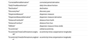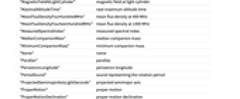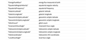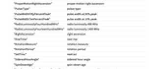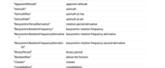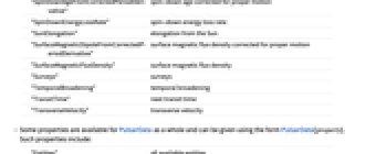 "AlphanumericName" alphanumeric name "AlternateNames" alternate names "Altitude" altitude "AltitudeMaximum" next maximum altitude "AltitudeTransit" next transit altitude "ApparentAltitude" apparent altitude "Azimuth" azimuth "AzimuthRise" azimuth at rise "AzimuthSet" azimuth at set "BarycentricPeriodDerivative" rotation period derivative "BarycentricRotationFrequency" barycentric rotation frequency "BarycentricRotationFrequencyDerivative" barycentric rotation frequency derivative "BarycentricRotationFrequencyDerivative2" barycentric rotation frequency second derivative "BinaryPeriod" binary period "BooleanRise" above the horizon "Classes" classes "Constellation" constellation "CorrectedPeriodDerivative" corrected period derivative "DailyTimeAboveHorizon" daily time above horizon "Declination" declination "DiscoveryYear" discovery year "DispersionMeasure" dispersion measure "DispersionMeasureDerivative" dispersion measure derivative "DistanceFromEarth" distance from Earth "DistanceFromSun" distance from Sun "DMSinb" dispersion measure times sin(b) "Eccentricity" orbital eccentricity "EccentricityTimesCosPeriastronLongitude" eccentricity times cos(periastron longitude) "EccentricityTimesSinPeriastronLongitude" eccentricity times sin(periastron longitude) "EnergyFluxAtSun" energy flux measured at Earth "EquatorialAngularVelocity" equatorial angular velocity "EquatorialFrequency" equatorial frequency "GalacticLatitude" galactic latitude "GalacticLongitude" galactic longitude "GeocentricEclipticLatitude" geocentric ecliptic latitude "GeocentricEclipticLongitude" geocentric ecliptic longitude "GlitchCount" glitch count "GreenwichHourAngle" Greenwich hour angle "HeliocentricEclipticLatitude" heliocentric ecliptic latitude "HeliocentricEclipticLongitude" heliocentric ecliptic longitude "HelioCoordinates" heliocentric XYZ coordinates "LocalHourAngle" local hour angle "MagneticFieldAtLightCylinder" magnetic field at light cylinder "MaximalAltitudeTime" next maximum altitude time "MeanFluxDensityFourHundredMHz" mean flux density at 400 MHz "MeanFluxDensityFourteenHundredMHz" mean flux density at 1400 MHz "MeasuredSpectralIndex" measured spectral index "MedianCompanionMass" median companion mass "MinimumCompanionMass" minimum companion mass "Name" name "Parallax" parallax "PeriastronLongitude" periastron longitude "PeriodSound" sound representing the rotation period "ProjectedSemimajorAxisLightSeconds" projected semimajor axis "ProperMotion" proper motion "ProperMotionDeclination" proper motion declination "ProperMotionRightAscension" proper motion right ascension "PulsarType" pulsar type "PulseWidthFiftyPercentPeak" pulse width at 50% peak "PulseWidthTenPercentPeak" pulse width at 10% peak "RadioLuminosityFourHundredMHz" radio luminosity 400 MHz "RadioLuminosityFourteenHundredMHz" radio luminosity 1400 MHz "RightAscension" right ascension "RiseTime" next rise "RotationMeasure" rotation measure "RotationPeriod" rotation period "SetTime" next set "SiderealHourAngle" sidereal hour angle "SpinDownAge" spin-down age "SpinDownAgeFromCorrectedPeriodDerivative" spin-down age corrected for proper motion "SpinDownEnergyLossRate" spin-down energy loss rate "SunElongation" elongation from the Sun "SurfaceMagneticDipoleFromCorrectedPeriodDerivative" surface magnetic flux density corrected for proper motion "SurfaceMagneticFluxDensity" surface magnetic flux density "Surveys" surveys "TemporalBroadening" temporal broadening "TransitTime" next transit time "TransverseVelocity" transverse velocity - Some properties are available for PulsarData as a whole and can be given using the form PulsarData[property]. Such properties include: