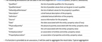 "Qualifiers" the list of possible qualifiers for the property "QualifierValues" the list of possible values that can be given to each qualifier "DefaultQualifierValues" the list of default values for the property's qualifiers "Description" a brief textual description of the property "Definition" a detailed textual definition of the property "Source" source information for the property "Date" the date associated with the entity-property value (if any) "PhysicalQuantity" the physical quantity associated with the entity-property value "Unit" the unit associated with the entity-property value "EntityAssociation" an association of entities and entity-property values "PropertyAssociation" an association of properties and entity-property values - If a function is provided as an annotation, it will be used to aggregate the result data. Typical aggregation functions include: