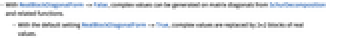 - With RealBlockDiagonalForm->False, complex values can be generated on matrix diagonals from SchurDecomposition and related functions.