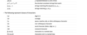 c the literal character c . any character except newline [c1c2…] any of the characters ci [c1-c2] any character in the range c1–c2 [^c1c2…] any character except the ci p* p repeated zero or more times p+ p repeated one or more times p? zero or one occurrence of p p{m,n} p repeated between m and n times p*?,p+?,p?? the shortest consistent strings that match (p1p2…) strings matching the sequence p1, p2, … p1|p2 strings matching p1 or p2 - The following represent classes of characters: