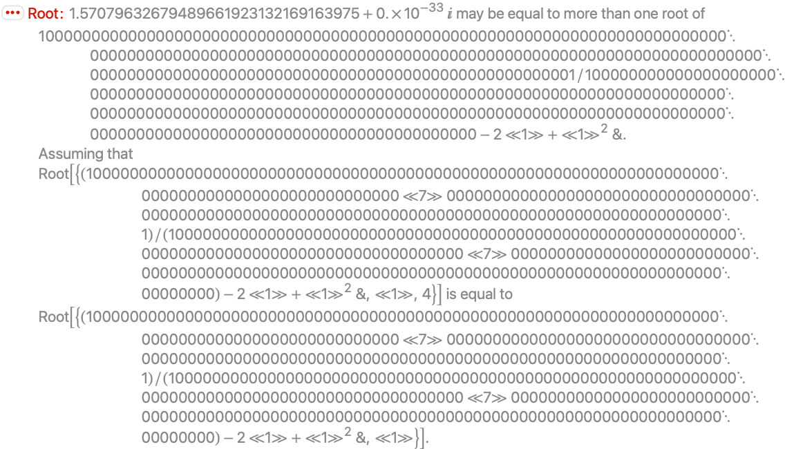 Numerical computation with a higher precision yields an approximation of one of the roots: