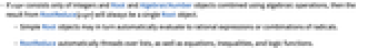 - Simple Root objects may in turn automatically evaluate to rational expressions or combinations of radicals.