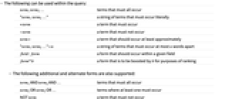 term1 term2 … terms that must all occur "term1 term2 …" a string of terms that must occur literally +term a term that must occur -term a term that must not occur term~ a term that should occur at least approximately "term1 term2 …"~n a string of terms that must occur at most n words apart field:form a form that should occur within a given field form^b a form that is to be boosted by b for purposes of ranking - The following additional and alternate forms are also supported: