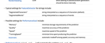 FeatureExtractor Automatic how to preprocess sequences Method Automatic which prediction algorithm to use PerformanceGoal Automatic aspects of performance to try to optimize RandomSeeding 1234 what seeding of pseudorandom generators should be done internally - Typical settings for FeatureExtractor for strings include: