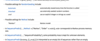 "NextElement" most likely next element "NextElement"n individually most likely next n elements "NextSequence"n most likely next length-n sequence of elements "RandomNextElement" random sample from the next-element distribution "RandomNextElement"n random sample from the next-sequence distribution "Probabilities" association of probabilities for all possible next elements "SequenceProbability" probability for the predictor to generate the given sequence "SequenceLogProbability" log probability for the predictor to generate the sequence "Properties" list of all properties available - Examples of built-in sequence predictors include: