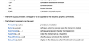 "PDF" probability density function "Intensity" count density function "CDF" cumulative distribution function "SF" survival function "HF" hazard function "CHF" cumulative hazard function - The form w[data] provides a wrapper w to be applied to the resulting graphics primitives.
