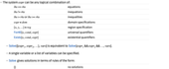 lhs==rhs equations lhs!=rhs inequations lhs>rhs or lhs>=rhs inequalities expr∈dom domain specifications {x,y,…}∈reg region specification ForAll[x,cond,expr] universal quantifiers Exists[x,cond,expr] existential quantifiers - Solve[{expr1,expr2,…},vars] is equivalent to Solve[expr1&&expr2&&…,vars].