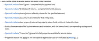 - SpectralLineData[level1->level2,"Entity"], SpectralLineData[level1->level2] and SpectralLineData[level1->level2,property] can be used to find and query for atomic line transitions and their properties.