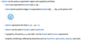 may be efficiently represented using Sphere[{p1,…,pk},r] and balls of varying radii represented using Sphere[{p1,…,pk},{r1,…,rk}]. - Sphere objects can be visually formatted in two and three dimensions using Graphics and Graphics3D, respectively. The appearance of Sphere objects in graphics can be modified by specifying the face directive FaceForm (in 3D); color directives such as Red; the transparency and specularity directives Opacity and Specularity; and the style option Antialiasing.
