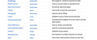 AlignmentPoint Center the default point in the graphic to align with AspectRatio 1/GoldenRatio ratio of height to width Axes Automatic whether to draw axes AxesLabel None axes labels AxesOrigin Automatic where axes should cross AxesStyle {} style specifications for the axes Background None background color for the plot BaselinePosition Automatic how to align with a surrounding text baseline BaseStyle {} base style specifications for the graphic ClippingStyle None what to draw when lines are clipped ColorFunction Automatic how to determine the coloring of lines ColorFunctionScaling True whether to scale arguments to ColorFunction ContentSelectable Automatic whether to allow contents to be selected CoordinatesToolOptions Automatic detailed behavior of the coordinates tool DataRange Automatic the range of x values to assume for data DateFunction Automatic how to convert dates to standard form DateTicksFormat Automatic format for date tick labels Epilog {} primitives rendered after the main plot Filling None how to fill in stems for each point FillingStyle Automatic style to use for filling FormatType TraditionalForm the default format type for text Frame True whether to put a frame around the plot FrameLabel None frame labels FrameStyle {} style specifications for the frame FrameTicks Automatic frame ticks FrameTicksStyle {} style specifications for frame ticks GridLines None grid lines to draw GridLinesStyle {} style specifications for grid lines ImageMargins 0. the margins to leave around the graphic ImagePadding All what extra padding to allow for labels etc. ImageSize Automatic the absolute size at which to render the graphic InterpolationOrder None the polynomial degree of curves used in joining data points IntervalMarkers Automatic how to render uncertainties IntervalMarkersStyle Automatic style for uncertainty elements Joined False whether to join points LabelingFunction Automatic how to label points LabelingSize Automatic maximum size of callouts and labels LabelingTarget Automatic how to determine automatic label positions LabelStyle {} style specifications for labels MaxPlotPoints Infinity the maximum number of points to include Mesh None how many mesh points to draw on each line MeshFunctions {#1&} how to determine the placement of mesh points MeshShading None how to shade regions between mesh points MeshStyle Automatic the style for mesh points Method None methods to use PlotFit None how to fit a curve to the points PlotFitElements Automatic fitted elements to show in the plot PlotHighlighting Automatic highlighting effect for curves PlotInteractivity $PlotInteractivity whether to allow interactive elements PlotLabel None overall label for the plot PlotLabels None labels for data PlotLayout "Stacked" how to position data PlotLegends None legends for datasets PlotMarkers None markers to use to indicate each point PlotRange Automatic range of values to include PlotRangeClipping True whether to clip at the plot range PlotRangePadding Automatic how much to pad the range of values PlotRegion Automatic the final display region to be filled PlotStyle Automatic graphics directives to determine styles of points PlotTheme $PlotTheme overall theme for the plot PreserveImageOptions Automatic whether to preserve image options when displaying new versions of the same graphic Prolog {} primitives rendered before the main plot RotateLabel True whether to rotate y labels on the frame ScalingFunctions None how to scale individual coordinates TargetUnits Automatic units to display in the plot Ticks Automatic axes ticks TicksStyle {} style specifications for axes ticks