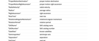 "AbsoluteMagnitude" absolute visual magnitude "AbsoluteMagnitudeBolometric" absolute bolometric magnitude "Age" age "AlphanumericName" alphanumeric name "AlternateNames" alternate names "Altitude" altitude "AltitudeTransit" next transit altitude "AngularDiameterFromEarth" angular diameter as seen from Earth "AngularRadiusFromEarth" angular radius as seen from Earth "Apoapsis" largest distance from orbit center "ApparentAltitude" apparent altitude "ApparentMagnitude" apparent magnitude "Azimuth" azimuth "AzimuthRise" azimuth at rise "AzimuthSet" azimuth at set "BayerName" Bayer name "BayerStandardName" Bayer standard name "BooleanRise" above the horizon "BVColorIndex" B-V color index "Classes" classes "Color" color "Component" component "Constellation" constellation "DailyTimeAboveHorizon" daily time above horizon "Declination" declination "Density" mean density "Diameter" average diameter "DistanceFromEarth" distance from Earth "DistanceFromSun" distance from Sun "DurchmusterungName" Durchmusterung name "DurchmusterungStandardName" Durchmusterung standard name "Eccentricity" orbital eccentricity "EffectiveTemperature" effective temperature "EquatorialDiameter" equatorial diameter "EquatorialRadius" equatorial radius "EscapeVelocity" escape velocity "FlamsteedName" Flamsteed name "FlamsteedStandardName" Flamsteed standard name "GalacticLatitude" galactic latitude "GalacticLongitude" galactic longitude "GeocentricEclipticLatitude" geocentric ecliptic latitude "GeocentricEclipticLongitude" geocentric ecliptic longitude "GlieseName" Gliese catalog designation "GlieseStandardName" Gliese catalog standard name designation "Glyph" astrological symbol "GravitationalConstantMassProduct" standard gravitational parameter "Gravity" gravity "GreenwichHourAngle" Greenwich hour angle "HDName" HD catalog name "HDNumber" HD catalog number "HeliocentricEclipticLatitude" heliocentric ecliptic latitude "HeliocentricEclipticLongitude" heliocentric ecliptic longitude "HelioCoordinates" heliocentric XYZ coordinates "HipparcosName" Hipparcos name "HipparcosNumber" Hipparcos number "HRName" HR catalog name "HRNumber" HR catalog number "ICNumber" IC number "LifetimeEntropy" entropy at the end of main sequence lifetime "LocalHourAngle" local hour angle "Luminosity" luminosity "LuminosityMassRateEquivalent" luminosity mass rate equivalent "MainSequenceLifetime" main sequence lifetime "MajorAxis" major axis "Mass" mass "MaximalAltitudeTime" next maximum altitude time "MaximumAbsoluteMagnitude" maximum absolute magnitude "MaximumApparentMagnitude" maximum apparent magnitude "Metallicity" metallicity "MinimumAbsoluteMagnitude" minimum absolute magnitude "MinimumApparentMagnitude" minimum apparent magnitude "MomentOfInertia" rotational moment of inertia "MultipleSystemMember" member of a multiple star system "Name" name "NGCNumber" NGC number "Oblateness" oblateness "Obliquity" obliquity "OrbitalAngularMomentum" orbital angular momentum "OrbitCenter" orbit center "OrbitPeriod" orbital period "Parallax" parallax "Periapsis" nearest distance from orbit center "PolarDiameter" polar diameter "PolarRadius" polar radius "PositionAngle" position angle "ProperMotion" proper motion "ProperMotionDeclination" proper motion declination "ProperMotionRightAscension" proper motion right ascension "RadialVelocity" radial velocity "Radius" average radius "RightAscension" right ascension "RiseTime" next rise "RotationalAngularMomentum" rotational angular momentum "RotationPeriod" rotation period "SAOName" SAO catalog name "SAONumber" SAO catalog number "Satellites" known satellites "SemimajorAxis" semimajor axis "Separation" separation "SetTime" next set "Shape" shape "SiderealHourAngle" sidereal hour angle "SpectralClass" spectral class "SpectralClassList" spectral class list "StarDistanceTimeSeries" distance from Earth time series "StarEndState" stellar end state "StarType" star type "StationaryOrbitRadius" stationary orbit radius "StationaryOrbitSpeed" stationary orbit speed "SunElongation" elongation from the Sun "SurfaceArea" surface area "SystemMembers" system members "TransitTime" next transit time "TychoNumber" Tycho number "VariablePeriod" variability period "VariableStarName" variable star name "VariableStarType" variable star type "Volume" volume "WDSIdentifier" WDS identifier - Some properties are available for StarData as a whole and can be given using the form StarData[property]. Such properties include: