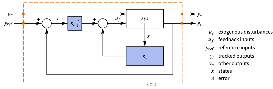 is the computed gain matrix for the augmented system that includes the system sys as well as the dynamics for