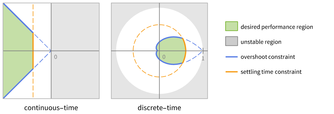 - Typically there are performance constraints such as settling time and quality constraints such as overshoot. These correspond to certain regions that are desirable pole locations.