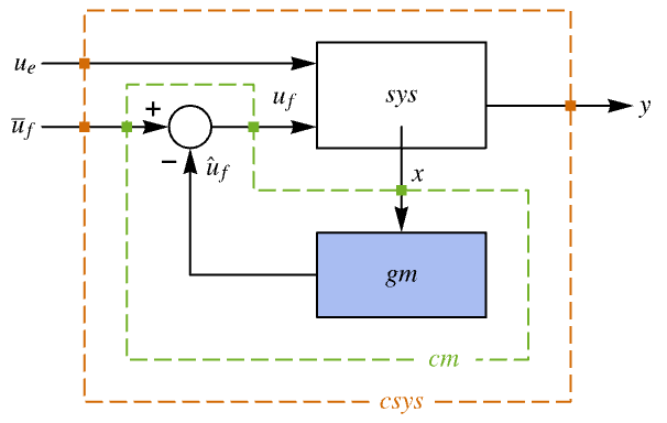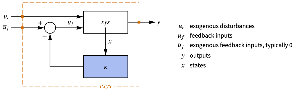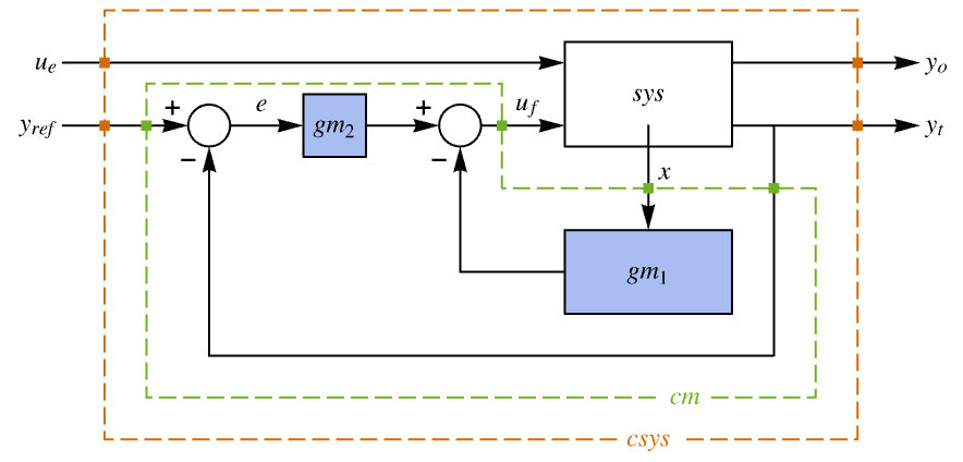 "BlockDiagram" block diagram of csys {"BlockDiagram",<|"SampledData"True|>} create a sampled data block diagram of csys "ClosedLoopPoles" poles of the linearized "ClosedLoopSystem" "ClosedLoopSystem" system csys {"ClosedLoopSystem", cspec} detailed control over the form of the closed-loop system "ControllerModel" model cm "Design" type of controller design "DesignModel" model used for the design "FeedbackGains" gain matrix κ or its equivalent "FeedbackGainsModel" model gm or {gm1,gm2} "FeedbackInputs" inputs uf of sys used for feedback "InputModel" input model sys "InputCount" number of inputs u of sys "OpenLoopPoles" poles of "DesignModel" "OutputCount" number of outputs y of sys "SamplingPeriod" sampling period of sys "StateCount" number of states x of sys "TrackedOutputs" outputs yt of sys that are tracked - Possible keys for cspec include: