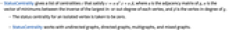 - StatusCentrality works with undirected graphs, directed graphs, multigraphs, and mixed graphs.